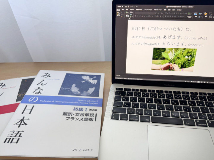 日本語教育とは少しズレるかもしれませんが、日本文化や日本特有のことに関する知識を自分なりに咀嚼してフランス語で説明ができるようになっておくと、授業に深みを持たせられるかもしれないなと思います。例えば「飲み会」や「残業」のような日本の会社のカルチャーは、使用教科書に出てくることもあり、伝えるようにしています。「日本らしい」写真をもっと沢山撮っておけばよかったと心から思います。例えば、自分が住んでいる街の桜や祭りの様子、郷土料理などです。授業はパワーポイントのスライドをメインで使用しているので、その素材に使えるような写真があると便利です。毎回フリー素材検索するのは地味に時間が奪われるので、帰国したら沢山写真を撮ろうと今から決めています。目安としては、使用する教科書(私の場合『みんなの日本語』)に出てくる単語やイラストの写真があるといいと思います。例えば歌舞伎や花見、電車など、写真があれば学習者も必ずスライドに注目してくれます。このようなアイキャッチにもなる写真があると便利だと思います。